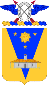 Shield: The regiment was organized in 1866. The field is yellow for the Cavalry and blue triangle with the sun and three five-pointed stars are from the old flag of the Philippine Insurrection with a change of color. The three stars represent the three tours of duty in the Islands. The blockhouse is the old pride of the regiment, a representation of the actual one which was taken at San Juan, Santiago, Cuba, in 1898. The wedge is blue in color and recalls the fact that the 9th split the Spanish line at Santiago with the capture of the blockhouse when they charged dismounted as Infantry.